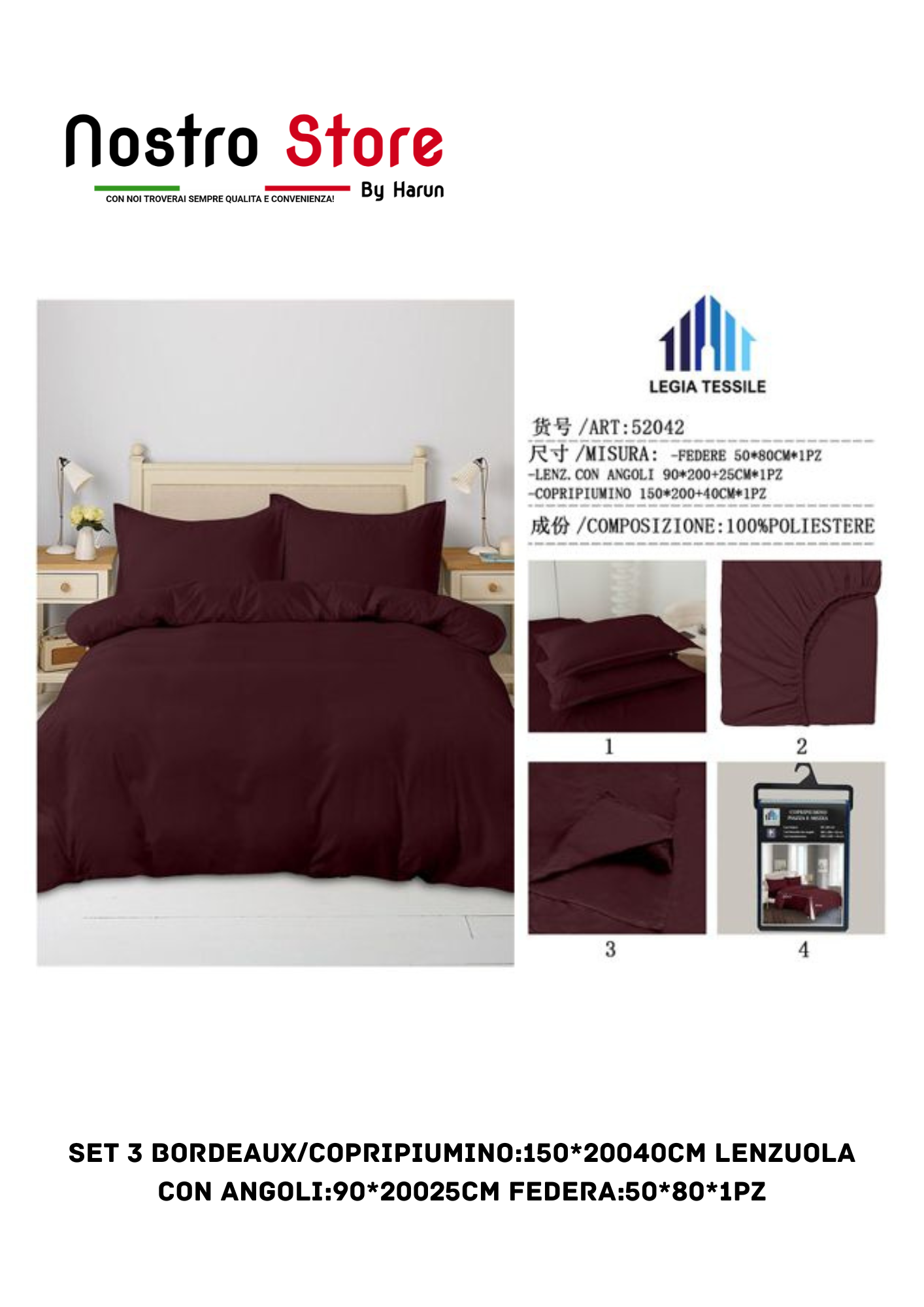 SET 3 BORDEAUX/COPRIPIUMINO:150*20040CM LENZUOLA con angoli:90*20025CM FEDERA:50*80*1PZ
