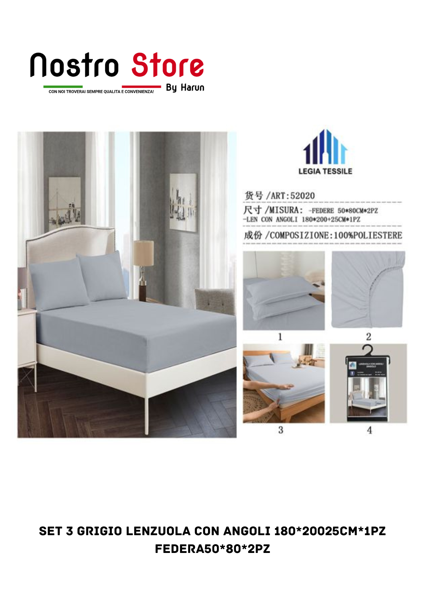 SET 3 GRIGIO LENZUOLA con angoli 180*20025CM*1PZ FEDERA50*80*2PZ