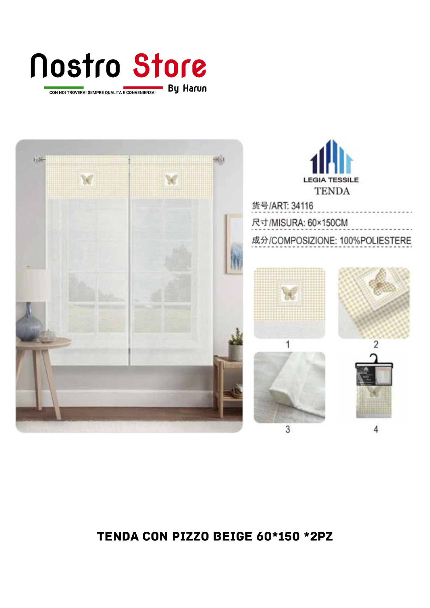 TENDA CON PIZZO BEIGE 60*150 *2PZ